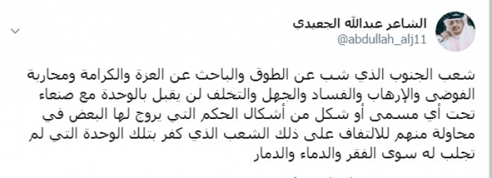 وكتب الجعيدي عبر تغريدة له على "تويتر" رصدها " المشهد العربي": "شعب الجنوب الذي شب عن الطوق والباحث عن العزة والكرامة ومحاربة الفوضى والإرهاب والفساد والجهل والتخلف لن يقبل بالوحدة مع صنعاء تحت أي مسمى أو شكل من أشكال الحكم التي يروج لها البعض في محاولة منهم للالتفاف على ذلك، الشعب الذي كفر بتلك الوحدة التي لم تجلب له سوى الفقر والدماء والدمار".