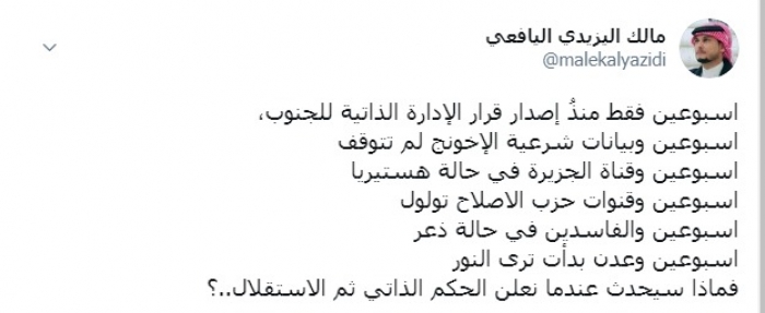 وكتب اليافعي عبر تغريدة له على "تويتر" رصدها " المشهد العربي": "أسبوعين فقط منذُ إصدار قرار الإدارة الذاتية للجنوب، أسبوعين وبيانات شرعية الإخونج لم تتوقف، أسبوعين وقناة الجزيرة في حالة هستيريا".