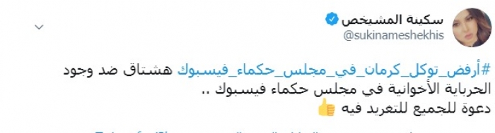 وكتبت المشيخص عبر تغريدة لها على "تويتر" رصدها " المشهد العربي":"أرفض توكل كرمان في مجلس حكماء فيسبوك"، هشتاج ضد وجود الحرباية الإخوانية في مجلس حكماء فيسبوك".