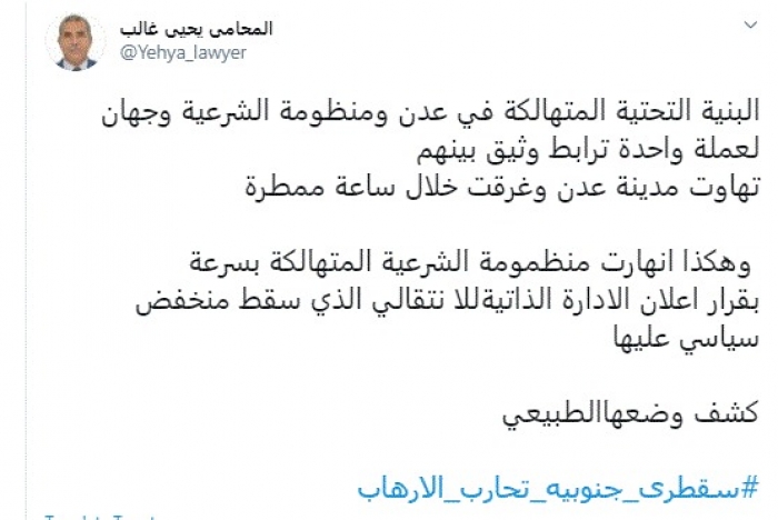 وكتب في تغريدة عبر "تويتر" رصدها "المشهد العربي": "البنية التحتية المتهالكة في عدن ومنظومة الشرعية وجهان لعملة واحدة ترابط وثيق بينهم، تهاوت مدينة عدن وغرقت خلال ساعة ممطرة".