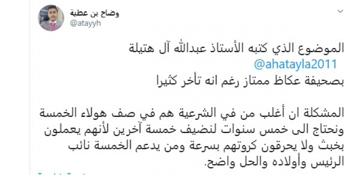 وقال في تغريدة عبر "تويتر" رصدها "المشهد العربي": "الموضوع الذي كتبه الأستاذ عبدالله آل هتيلة بصحيفة عكاظ ممتاز رغم أنه تأخر كثيرًا المشكلة أن أغلب من في الشرعية هم في صف هولاء الخمسة ونحتاج إلى خمس سنوات لنضيف خمسة آخرين لأنهم يعملون بخبث ولا يحرقون كروتهم بسرعة ومن يدعم الخمسة نائب الرئيس وأولاده والحل واضح".