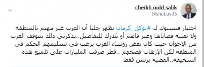 وكتب عبر تغريدة له على "تويتر" رصدها " المشهد العربي": "اختيار فيسبوك لتوكل كرمان يظهر جليا أن الغرب غير مهتم بالمنطقة ولا تعنيه قضاياها وغير فاهم أو مُدرك للتفاصيل".