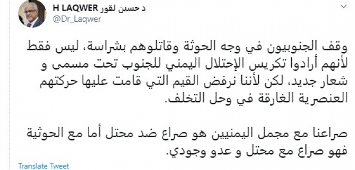 وكتب في تغريدة عبر "تويتر" رصدها "المشهد العربي": "وقف الجنوبيون في وجه الحوثة وقاتلوهم بشراسة، ليس فقط لأنهم أرادوا تكريس الاحتلال اليمني للجنوب تحت مسمى وشعار جديد، لكن لأننا نرفض القيم التي قامت عليها حركتهم العنصرية الغارقة في وحل التخلف".