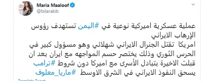 وقالت في تغريدة عبر "تويتر" رصدها "المشهد العربي": "عملية عسكرية أمريكية نوعية في اليمن تستهدف رؤوس الاٍرهاب الإيراني. أمريكا تقتل الجنرال الإيراني شهلائي وهو مسؤول كبير في الحرس الثوري".