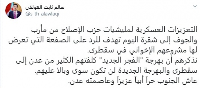 وأضاف: "نذكرهم أن بهرجة الفجر الجديد كلفتهم الكثير من عدن إلى سقطرى والبهرجة الجديدة لن تكون سوى وبالا عليهم. عاش الجنوب حراً أبياً عزيزاً وعاصمته عدن".