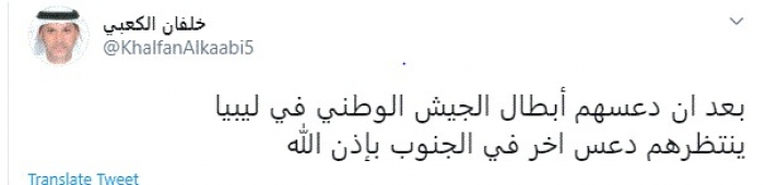 وقال في تغريدة عبر "تويتر" رصدها "المشهد العربي": "بعد أن دعسهم أبطال الجيش الوطني في ليبيا ينتظرهم دعس آخر في الجنوب بإذن الله".
