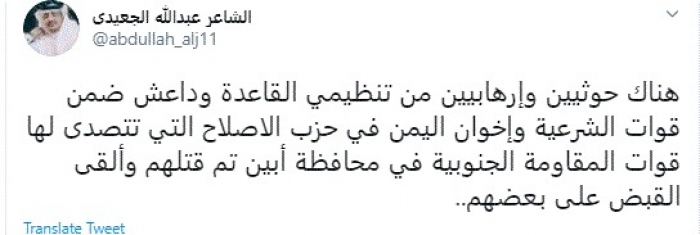 وكتب في تغريدة عبر "تويتر" رصدها "المشهد العربي": "هناك حوثيين وإرهابيين من تنظيمي القاعدة وداعش ضمن قوات الشرعية وإخوان اليمن في حزب الإصلاح التي تتصدى لها قوات المقاومة الجنوبية في محافظة أبين تم قتلهم وألقى القبض على بعضهم".