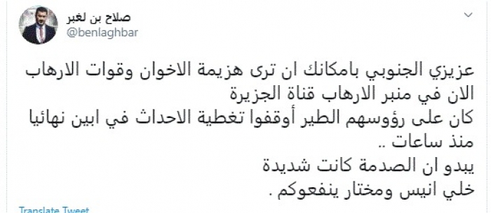 وكتب في تغريدة عبر "تويتر" رصدها "المشهد العربي": "عزيزي الجنوبي بإمكانك أن ترى هزيمة الإخوان وقوات الإرهاب الآن في منبر الإرهاب قناة الجزيرة".