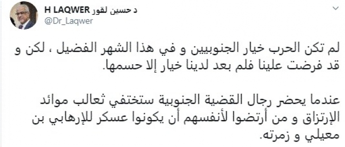 وقال في تغريدة عبر "تويتر" رصدها "المشهد العربي": "لم تكن الحرب خيار الجنوبيين وفي هذا الشهر الفضيل ، لكن وقد فرضت علينا فلم بعد لدينا خيار إلا حسمها".