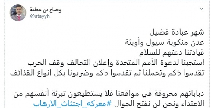 وقال في تغريدة عبر "تويتر" رصدها "المشهد العربي": "شهر عبادة فضيل، عدن منكوبة سيول وأوبئة، قيادتنا دعتهم للسلام، استجبنا لدعوة الأمم المتحدة وإعلان التحالف وقف الحرب".