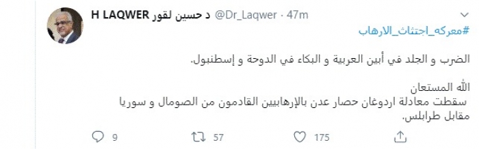 وأضاف: "الله المستعان سقطت معادلة أردوغان حصار عدن بالإرهابيين القادمين من الصومال وسوريا مقابل طرابلس".