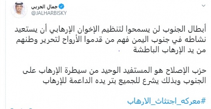 وكتب في تغريدة عبر "تويتر" رصدها "المشهد العربي": "أبطال الجنوب لن يسمحوا لتنظيم الإخوان الإرهابي أن يستعيد نشاطه في جنوب اليمن فهم من قدموا الأرواح لتحرير وطنهم من يد الإرهاب الباطشة".