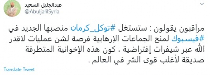 وكتب في تغريدة عبر "تويتر" رصدها "المشهد العربي": "مراقبون يقولون: ستستغل توكل كرمان منصبها الجديد في فيسبوك لمنح الجماعات الإرهابية فرصة لشن عمليات لاقدر الله عبر شيفرات افتراضية، كون هذه الإخوانية المتطرفة صديقة لأغلب قوى الشر في العالم".