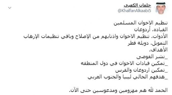 وكتب الكعبي عبر تغريدة له على "تويتر" رصدها " المشهد العربي": "تنظيم الإخوان المسلمين؛ القيادة أردوغان، الأدوات تنظيم الإخوان أذنابهم من الإصلاح وباقي تنظيمات الإرهاب، التمويل دويلة قطر".