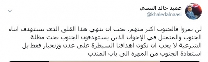 وكتب النسي عبر تغريدة له على "تويتر" رصدها " المشهد العربي": "لن يمروا فالجنوب أكبر منهم، يجب أن ننهي هذا القلق الذي يستهدف أبناء الجنوب والمتمثل في الإخوان الذين يستهدفون الجنوب تحت مظلة الشرعية".