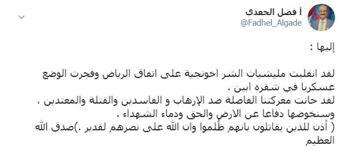 وكتب الجعدي عبر تغريدة له على "تويتر" رصدها " المشهد العربي": "لقد انقلبت مليشيات الشر اخونجية على اتفاق الرياض وفجرت الوضع عسكريا في شقرة أبين".