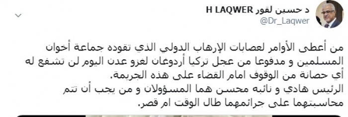 وكتب لقور عبر تغريدة له على "تويتر" رصدها " المشهد العربي": "من أعطى الأوامر لعصابات الإرهاب الدولي التي تقودها جماعة الإخوان المسلمين و مدفوعا من عجل تركيا أردوغان لغزو عدن اليوم، لن تشفع له أي حصانة من الوقوف أمام القضاء على هذه الجريمة".