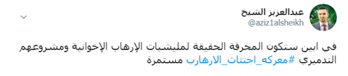 وكتب الشيخ عبر تغريدة له على "تويتر" رصدها " المشهد العربي": "في أبين ستكون المحرقة الحقيقة لمليشيات الإرهاب الإخوانية ومشروعهم التدميري".