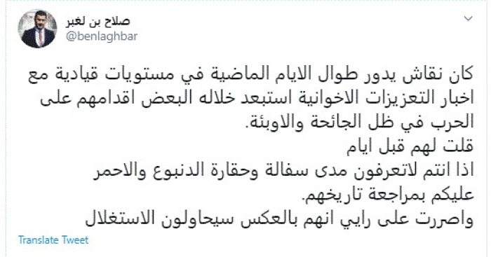 وكتب في تغريدة عبر "تويتر" رصدها "المشهد العربي": "كان نقاش يدور طوال الأيام الماضية في مستويات قيادية مع أخبار التعزيزات الإخوانية استبعد خلاله البعض إقدامهم على الحرب في ظل الجائحة والأوبئة".