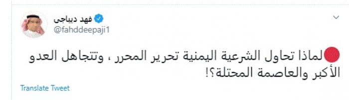 وقال في تغريدة عبر "تويتر" رصدها "المشهد العربي": "لماذا تحاول الشرعية اليمنية تحرير المحرر، وتتجاهل العدو الأكبر والعاصمة المحتلة".