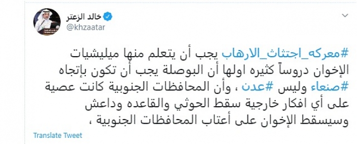وكتب في تغريدة عبر "تويتر" رصدها "المشهد العربي": "معركة اجتثاث الإرهاب يجب أن يتعلم منها مليشيات الإخوان دروساً كثيرة أولها أن البوصلة يجب أن تكون باتجاه صنعاء وليس عدن".