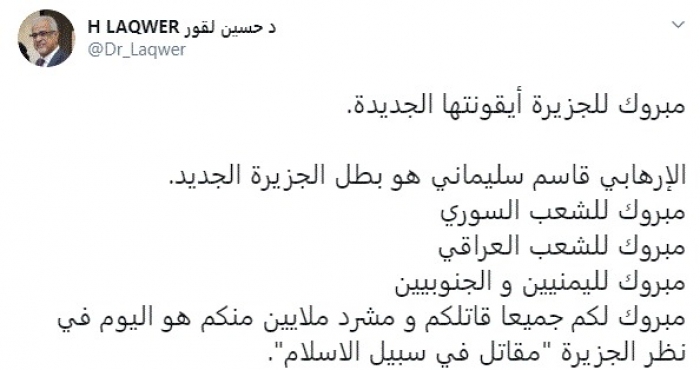 وكتب في تغريدة عبر "تويتر" رصدها "المشهد العربي": "مبروك للجزيرة أيقونتها الجديدة. الإرهابي قاسم سليماني هو بطل الجزيرة الجديد".