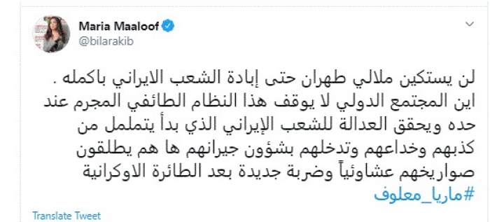 وكتبت في تغريدة عبر "تويتر" رصدها "المشهد العربي": "لن يستكين ملالي طهران حتى إبادة الشعب الإيراني بأكمله . أين المجتمع الدولي لا يوقف هذا النظام الطائفي المجرم عند حده ويحقق العدالة للشعب الإيراني الذي بدأ يتململ من كذبهم وخداعهم وتدخلهم بشؤون جيرانهم ها هم يطلقون صواريخهم عشاوئياً وضربة جديدة بعد الطائرة الأوكرانية".