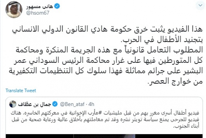 وكتب في تغريدة عبر "تويتر" رصدها "المشهد العربي": "هذا الفيديو يثبت خرق حكومة هادي القانون الدولي الإنساني بتجنيد الأطفال في الحرب".