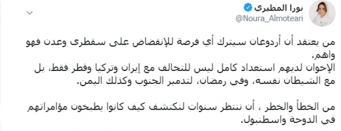 وكتبت المطيري عبر تغريدة لها على "تويتر" رصدها " المشهد العربي": "من يعتقد أن أردوغان سيترك أي فرصة للانقضاض على سقطرى وعدن فهو واهم".