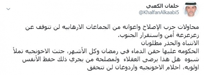 وكتب الكعبي عبر تغريدة له على "تويتر" رصدها " المشهد العربي": "محاولات حزب الإصلاح وأعوانه من الجماعات الإرهابية لن تتوقف عن زعزعة أمن واستقرار الجنوب، الانتباه والحذر مطلوبان".