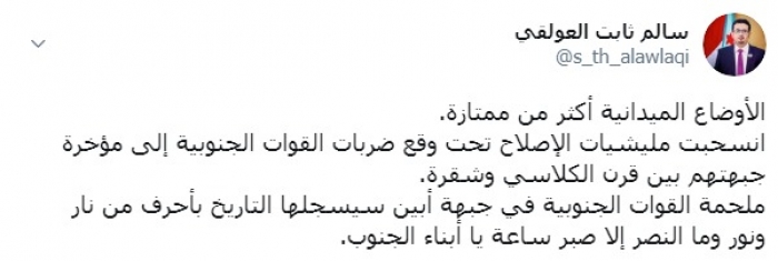 وكتب عبر تغريدة له على "تويتر" رصدها " المشهد العربي": "الأوضاع الميدانية أكثر من ممتازة، انسحبت مليشيات الإصلاح تحت وقع ضربات القوات الجنوبية إلى مؤخرة جبهتهم بين قرن الكلاسي وشقرة".