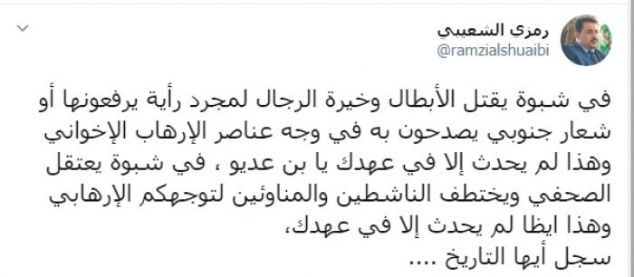 وكتب عبر تغريدة له على "تويتر" رصدها "المشهد العربي": "في شبوة يقتل الأبطال وخيرة الرجال لمجرد رأي يرفعونه، أو شعار جنوبي يصدحون به في وجه عناصر الإرهاب الإخواني وهذا لم يحدث إلا في عهدك يا بن عديو، في شبوة يعتقل الصحفي ويختطف الناشطين والمناوئين لتوجهكم الإرهابي وهذا أيضا لم يحدث إلا في عهدك، سجل أيها التاريخ".