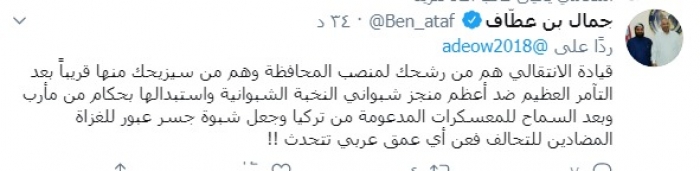 وكتب عبر تغريدة له على "تويتر" رصدها "المشهد العربي": "قيادة الانتقالي هم من رشحوك لمنصب المحافظة وهم من سيزيحونك منها قريبا بعد التآمر العظيم ضد أعظم منجز شبواني النخبة الشبوانية واستبدالها بحكام من مأرب وبعد السماح للمعسكرات المدعومة من تركيا وجعل شبوة جسر عبور للغزاة المضادين للتحالف فعن أي عمق عربي تتحدث".