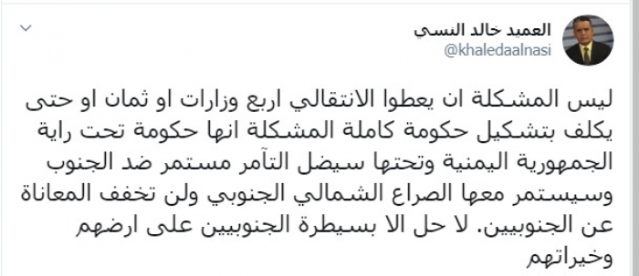 أكد الكاتب والمحلل العسكري، العميد خالد النسي، أنه لا حل إلا بسيطرة شعب الجنوب على أرضه وثروات الجنوب.