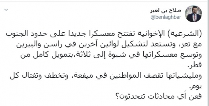 وكتب عبر تغريدة له على"تويتر" رصدها" المشهد العربي": "الشرعية الإخوانية تفتتح معسكرًا جديدًا على حدود الجنوب مع تعز، وتستعد لتشكيل لواءين آخرين في راسن والبيرين وتوسع معسكراتها في شبوة إلى ثلاثة، بتمويل كامل من قطر، ومليشياتها تقصف المواطنين في ميفعة، وتخطف وتغتال كل يوم، فعن أي محادثات تتحدثون؟".