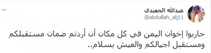 وكتب الجعيدي عبر تغريدة له على "تويتر" رصدها " المشهد العربي": "حاربوا إخوان اليمن في كل مكان أن أردتم ضمان مستقبلكم ومستقبل أجيالكم والعيش بسلام".