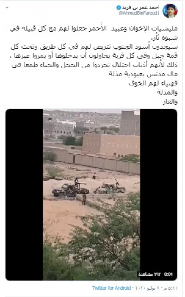 وكتب "بن فريد" تغريدة عبر حسابه بتويتر، رصدها "المشهد العربي": "مليشيات الإخوان وعبيد الأحمر جعلوا لهم مع كل قبيلة في شبوة ثأرا".