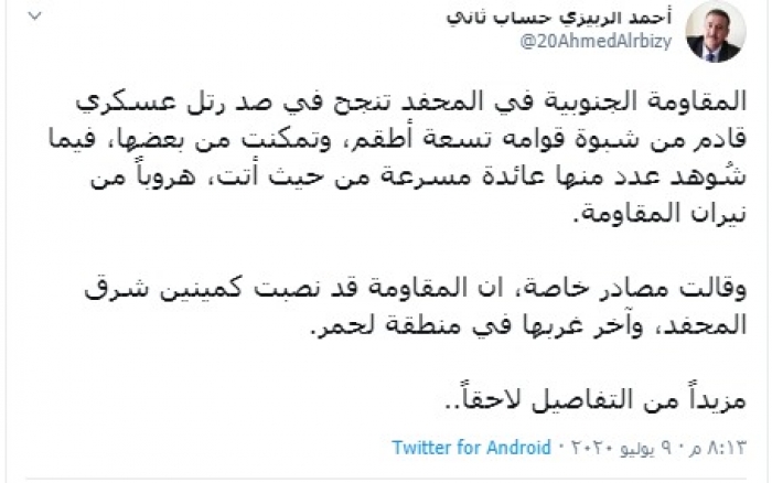 وكتب "الربيزي" تغريدة عبر حسابه بتويتر، رصدها "المشهد العربي": "المقاومة الجنوبية في المحفد تنجح في صد رتل عسكري قادم من شبوة قوامه تسعة أطقم، وتمكنت من بعضها، فيما شُوهد عدد منها عائدة مسرعة من حيث أتت، هروبا من نيران المقاومة".