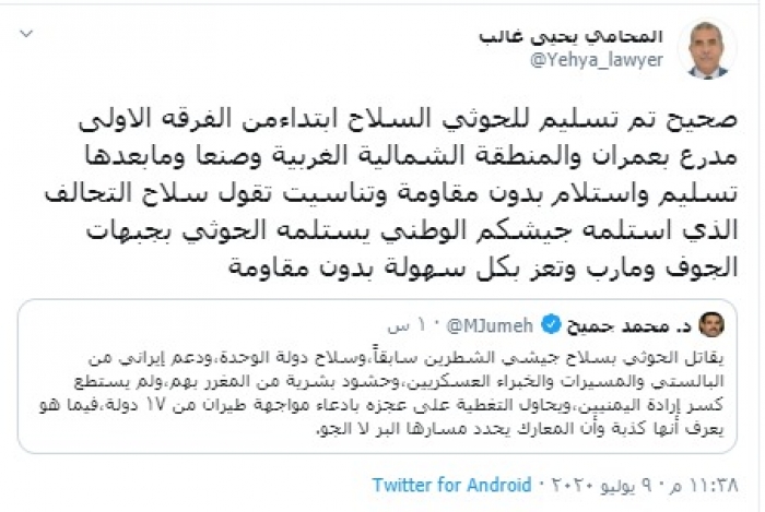 وكتب "غالب" تغريدة عبر حسابه بتويتر، رصدها "المشهد العربي": "صحيح تم تسليم للحوثي السلاح ابتداء من الفرقه الأولى مدرع بعمران والمنطقة الشمالية الغربية وصنعاء وما بعدها تسليم واستلام بدون مقاومة وتناسيت تقول سلاح التحالف الذي استلمه جيشكم الوطني يستلمه الحوثي بجبهات الجوف ومأرب وتعز بكل سهولة بدون مقاومة".