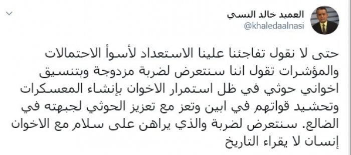 وكتب عبر تغريدة له على "تويتر" رصدها " المشهد العربي": "حتى لا نقول تفاجئنا علينا الاستعداد لأسوأ الاحتمالات، والمؤشرات تقول أننا سنتعرض لضربة مزدوجة وبتنسيق إخواني حوثي في ظل استمرار الإخوان بإنشاء المعسكرات وتحشيد قواتهم في أبين وتعز مع تعزيز الحوثي لجبهته في الضالع، سنتعرض لضربة والذي يراهن على سلام مع الإخوان إنسان لا يقرأ التاريخ".