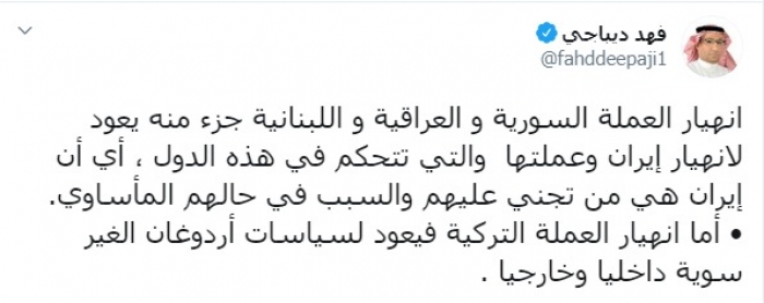وكتب عبر تغريدة له على "تويتر" رصدها " المشهد العربي": "انهيار العملة السورية و العراقية و اللبنانية جزء منه يعود لانهيار إيران وعملتها والتي تتحكم في هذه الدول، أي أن إيران هي من تجني عليهم والسبب في حالهم المأساوي، أما انهيار العملة التركية فيعود لسياسات أردوغان الغير سوية داخليا وخارجيا" .