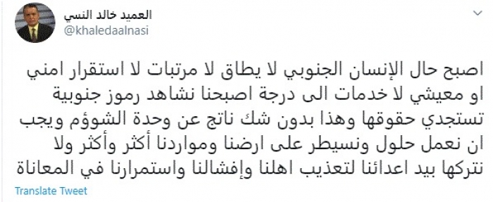 طالب الكاتب والمحلل العسكري العميد خالد النسي، اليوم، بعدم ترك أرض وموارد الجنوب للأعداء، وذلك بهدف عدم استمرار معاناة الجنوبيين.