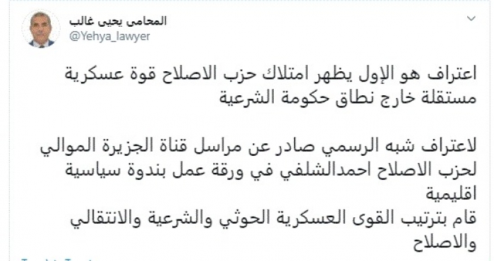 وقال في تغريدة عبر "تويتر" رصدها "المشهد العربي": "اعتراف هو الأول يظهر امتلاك حزب الإصلاح قوة عسكرية مستقلة خارج نطاق حكومة الشرعية".