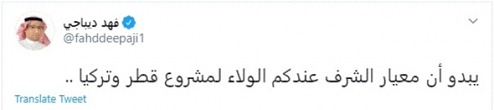 وقال في تغريدة عبر "تويتر" رصدها "المشهد العربي": "يبدو أن معيار الشرف عندكم الولاء لمشروع قطر وتركيا".