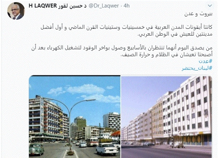 وقال في تغريدة عبر "تويتر" رصدها "المشهد العربي": "بيروت وعدن كانتا أيقونات المدن العربية في خمسينيات وستينيات القرن الماضي وأول أفضل مدينتين للعيش في الوطن العربي".