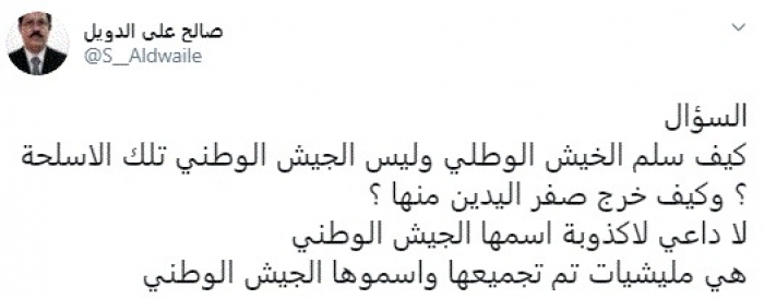 هاجم الناشط السياسي صالح الدويل، اليوم، ما يسمى بقوات الجيش الوطني التابع لحكومة الشرعية، مؤكدًا أنه مجرد مليشيات تم تجميعها.