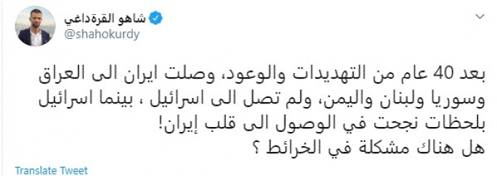 وقال في تغريدة عبر "تويتر" رصدها "المشهد العربي": "بعد 40 عام من التهديدات والوعود، وصلت إيران إلى العراق وسوريا ولبنان واليمن، ولم تصل إلى اسرائيل، بينما إسرائيل بلحظات نجحت في الوصول إلى قلب إيران!.. هل هناك مشكلة في الخرائط؟".