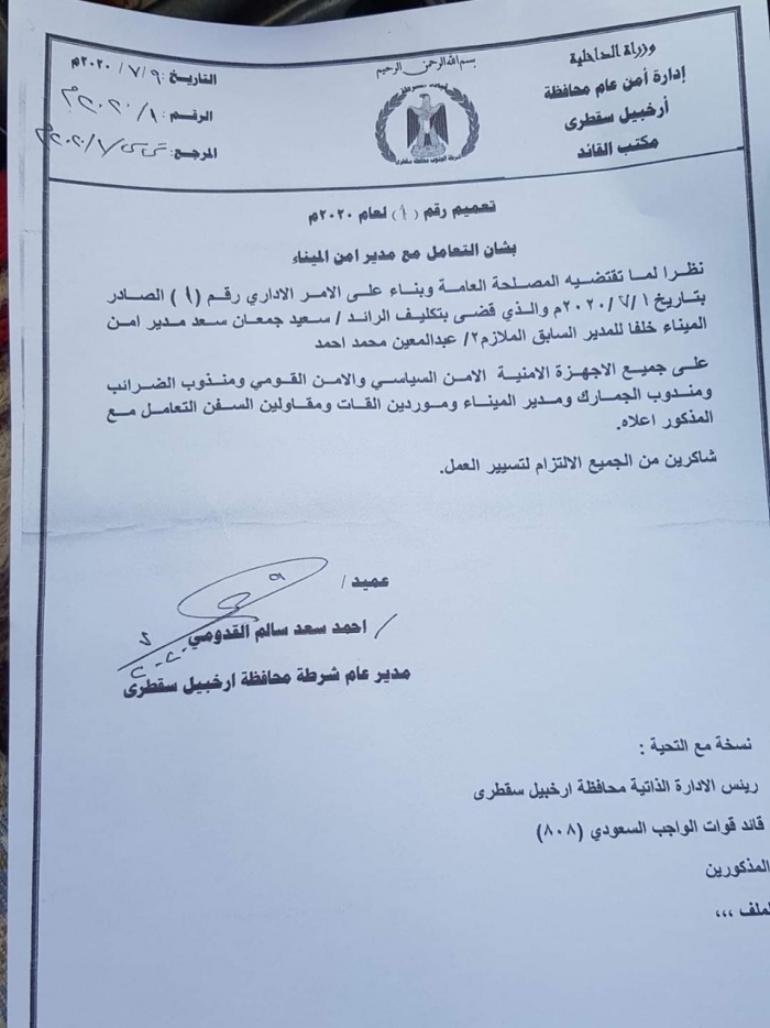 وجهت شرطة محافظة أرخبيل سقطرى، جميع الأجهزة الأمنية بما فيها الأمن السياسي والأمن القومي، وكذلك مندوبي الضرائب والجمارك بالتعامل مع المدير الجديد لأمن ميناء حولف الرائد سعيد جمعان سعد.