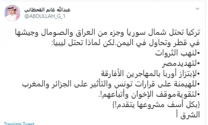 وقال في تغريدة عبر "تويتر" رصدها "المشهد العربي": "تركيا تحتل شمال سوريا وجزء من العراق والصومال وجيشها في قطر وتحاول في اليمن. لكن لماذا تحتل ليبيا: