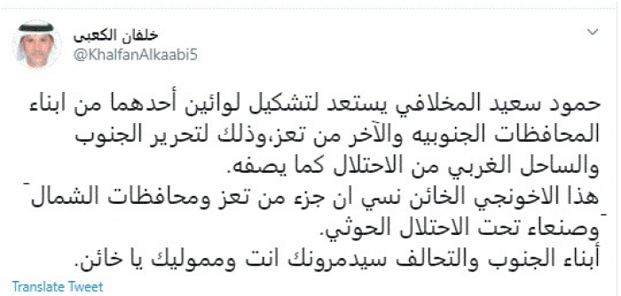 وقال في تغريدة عبر "تويتر" رصدها "المشهد العربي": "حمود سعيد المخلافي يستعد لتشكيل لوائين أحدهما من أبناء المحافظات الجنوبية والآخر من تعز، وذلك لتحرير الجنوب والساحل الغربي من الاحتلال كما يصفه".